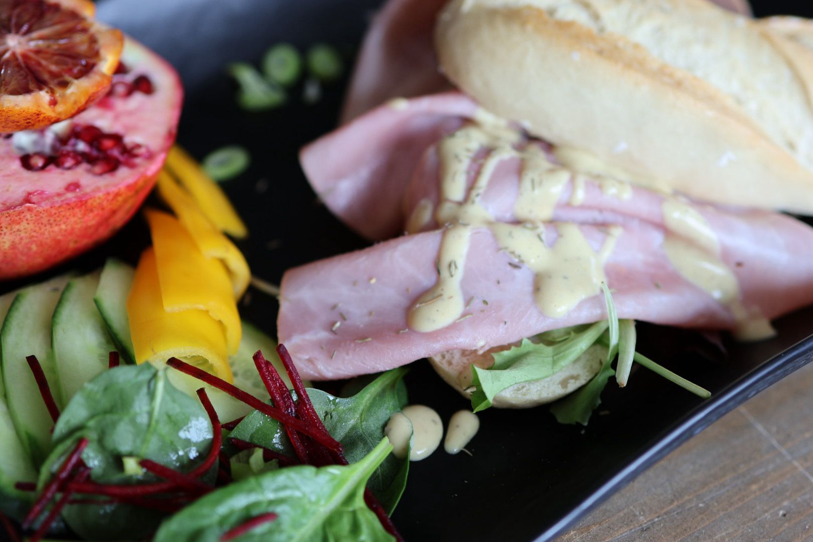 Vers afgebakken pistoletje met warme beenham, rijkelijk overgoten met honingmosterdsaus op een bedje van rucola